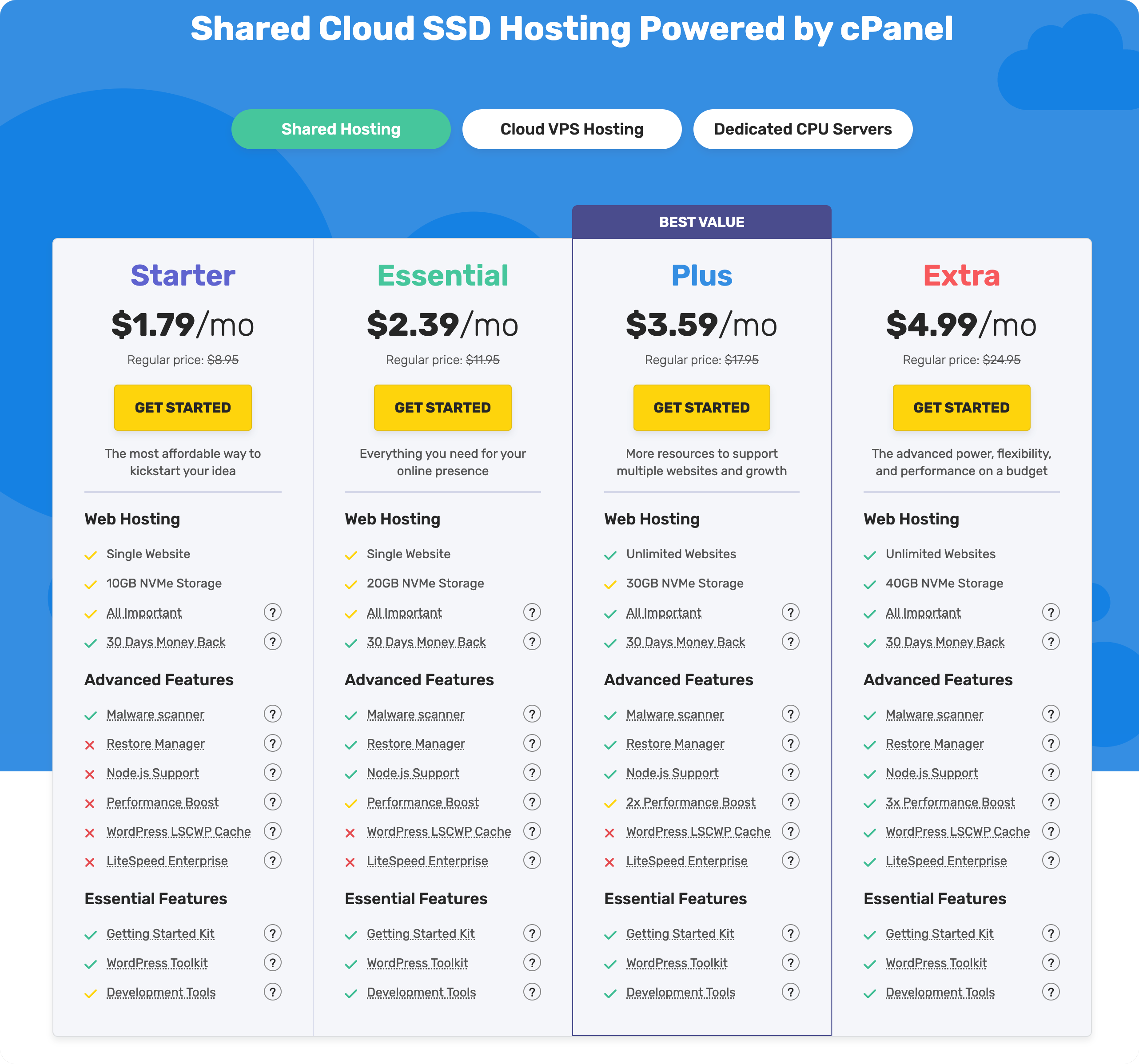 - Starter Plan:最便宜入门套餐,仅$1.79/月起(非常适合新站 / 个人博客 / 测试项目)。